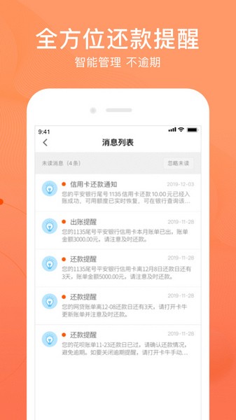 2.智能提醒:账单日、还款日、还款金额智能提醒,避免逾期被罚息;