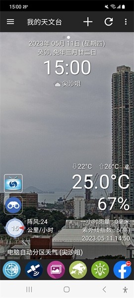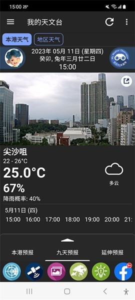 我的天文台app是一款受欢迎的天气流动应用程序,可以查看香港天气信息、最新天气警告推送和定点降下雨水服务等。我的天文台软件提供一系列的个人化天气服务,其会显示最接近用户指定位置或所选气象站所提供的实况天气,如温湿度、雨量、风向、风速等。我的天文台数据中的天气照片及雨量分别每五分钟及十五分钟更新一次,其余数据每十分钟更新一次,并且会将更新时间显示在首部底端,方便用户查看。利用我的天文台可以快捷的查看部分地区的气象地图,通过查询来为用户的出行做出充分的准备。