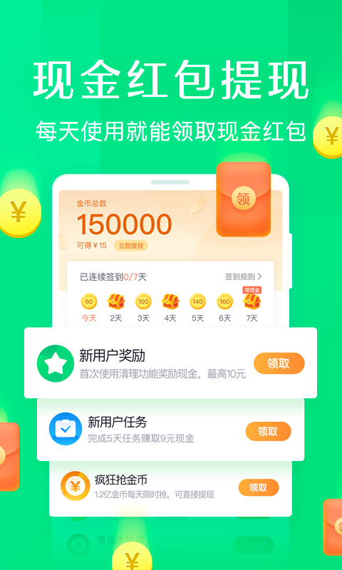 软件有很多特色功能,比如微信QQ专清、短视频专清、强力内存加速、通知栏收纳等,能满足不同用户的需求。除此之外,它还加入了应用红包、幸运转盘、金币提现等趣味小工具,让清理手机的同时还能赚点小钱,挺有意思的。