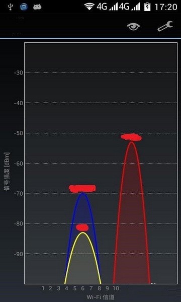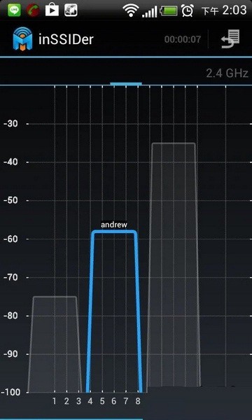 查看2.4GHz频段信道使用情况,这是inSSIDer非常有亮点的一个功能(纵坐标:信号强度,横坐标:14信道)。在这里我们不仅可以看到每个无线热点所占用的无线信道,还能看到该热点的信号强度。此时,信号强度强,占用信道不拥挤的无线热点就是你的选择。