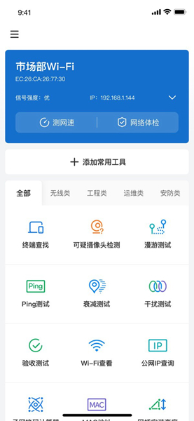 1、无线类小工具:网络体检、测速、终端查找、摄像头检测、漫游、衰减、干扰、验收、Wi-Fi查看;