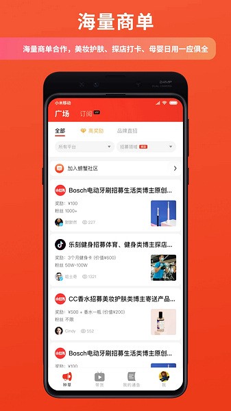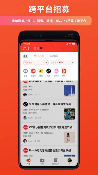 跨平台招募:支持各大社交媒体,资源丰富,博主活跃。