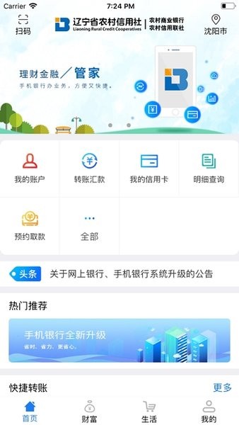 辽宁农信最新版本App,一般又称辽宁省农村信用社手机银行app,是一款移动试手机银行金融信息服务平台,不但支持在线办理多种不同类型的便捷生活业务,无论是手机充值、Q币充值亦或是购买电影票、公积金查询等全都有所包含,充分满足你对快捷便利生活的众多需求,而且你在辽宁农信中还可以直接将相关常用功能添加到首页上,以此来帮助你更加轻松的进行个性化设置管理。