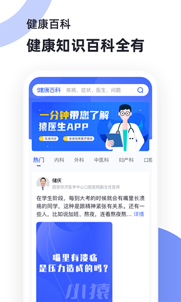 猿医生互联网医院app是一款专业的在线医疗咨询软件,功能挺强大的。你可以通过图文、语音或视频的方式和执业医师交流,问病症、用药指导啥的都行,特别方便。还有预约挂号、快速问诊这些服务,直接省去了排队挂号的时间,真是造福了不少人。