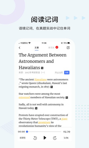 我最喜欢的是它的阅读记词功能,能把单词放在真实语境中学习,这样记得更牢了。而且它还有详细的单词讲解和真题素材,这对备考的学生来说特别有用。特别是针对考研和四六级考试人群设计的精细化词库,感觉非常贴心。