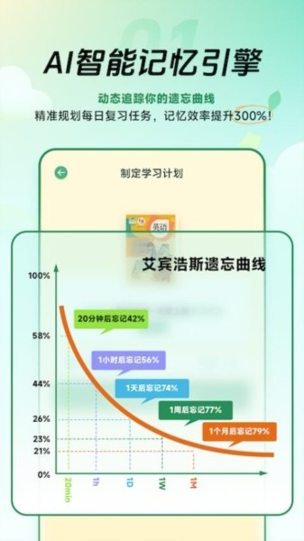 1、独家遗忘曲线算法会动态监测用户记忆状况,智能安排复习计划,在即将遗忘时及时推送提醒,让复习效率提升50%以上。
