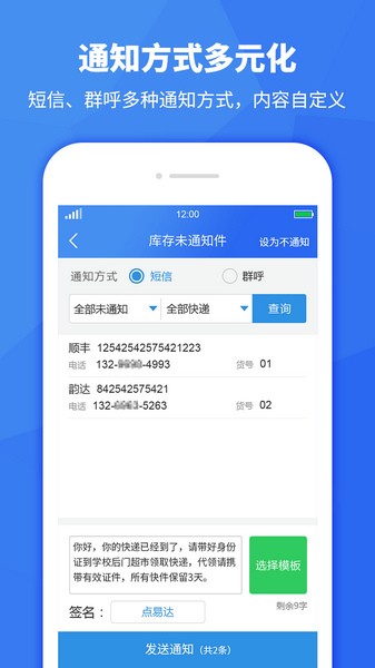 4、选择短信、群呼等多种通知方式,并自定义通知内容,快速进行群发;