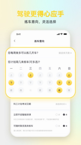 2、返回首页,有练车计划的学员点开“智能排课开关”。打开后选择周一至周日的练车时间(时间段可多选)。学员可点击预学习观看科目相关教学视频;