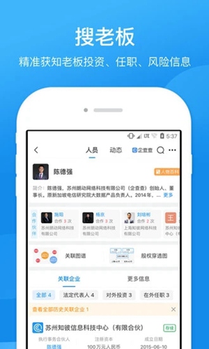 信息全面:和工商局数据对接,查关系,查信用,被执行,专项查询功能即刻找出关联企业或法人股东。