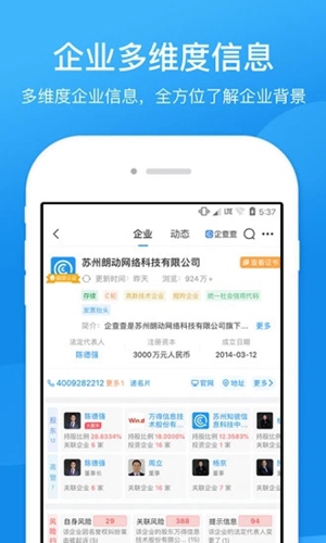 操作便捷:输入企业名称,看股东是谁,理清投资关系,一键获取企业工商信息,堪称企业征信查询神器;炫酷的企业图谱,融资记录,最新的企业年报,一目了然。