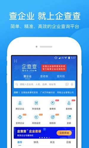 企查查APP是一款主打企业信用信息查询的软件,界面简洁清爽,功能丰富强大,帮助用户快速查询某企业的各项信息,囊括名称、股东高管、企业地址、周边公司、招投标、品牌产品等,以便甄别真假、皮包公司,避免合作、就业踩坑,让你更安心!同时软件还支持查询企业资讯,助你时刻把握企业动态!快来下载试试吧!