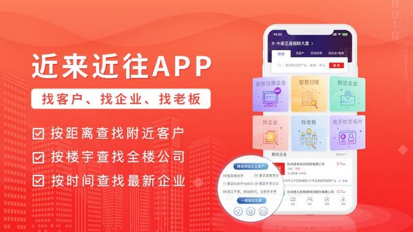 近来近往app安卓版是一款能够帮助用户寻找合适客户的办公软件。这款软件可以让用户查询自己附近所有公司企业的信息,了解每家公司的主营业务和旗下的产品,帮助用户寻找有合作可能的企业客户,让用户有更多的渠道来寻找合适的客源。此外,个人用户也可以使用这款软件来查找附近的商家店铺之类的信息。