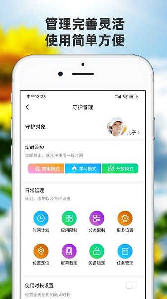 在这个充满数字诱惑的时代,家长们如何科学合理地管理孩子们使用电子设备的时间成为了一项挑战。向阳花守护家长端app通过开放、学习、禁止三种使用模式,为家长提供了全方位的管控工具。