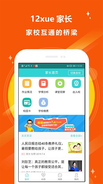 12xue家长app是一款专门为家长们打造的教育管理软件,通过该软件可以轻松实现家校沟通,家长们可以与学校的老师们零距离沟通,孩子们在学校有任何问题老师都可以在该平台内告知家长,同时也让家长们可以随时了解孩子在学校的学习情况。在这里家长们可以查看到老师上传的成绩,通过孩子们各个阶段的考试成绩来及时发现问题,及时改变自己的教育方针等。