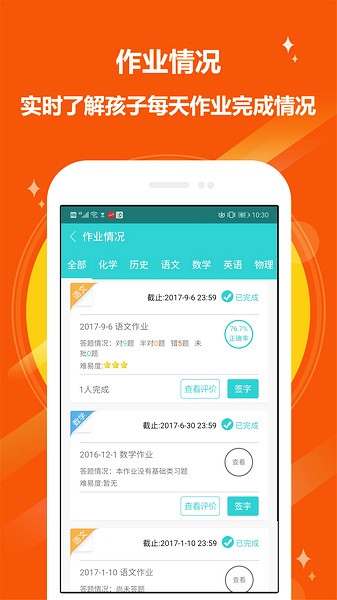 孩子每次作业完成情况都有相应的统计,具体到每一个科目。