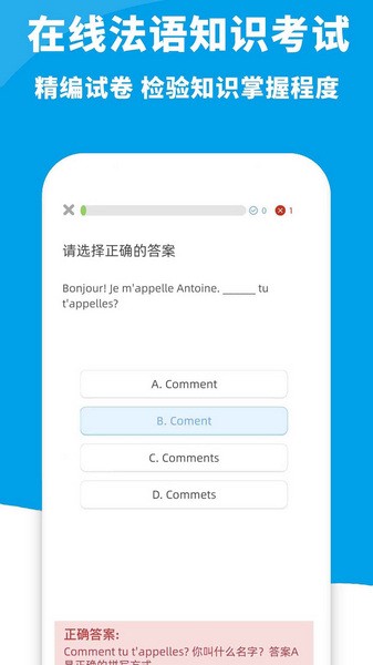 用户可以通过法语的知识题库来进行答题,能够通过答题的方式练习提升;