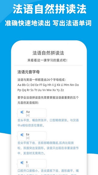 提供了法语的自然拼读法来进行学习和练习,能够更准确的进行拼读学习;