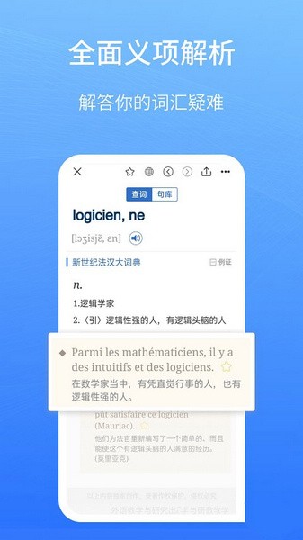 外研社法语大词典是一款专为法语学习者打造的查词软件,智能的查词体系不仅可以为大家提供法汉互译服务,大家还可以快速获得相应的例句内容,更好的理解和学习目标单词的释义用法。软件还有句库学习和单词记忆模块,让大家在查词的时候也能够轻松完成背单词的学习任务。软件内容丰富、查询方便,还有贴心的口语、听写练习模块,真正帮助大家提高法语水平。