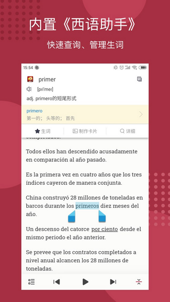 - 与权威的西班牙语词典软件《西班牙语助手》无缝集成,查词典、背单词轻松搞定。