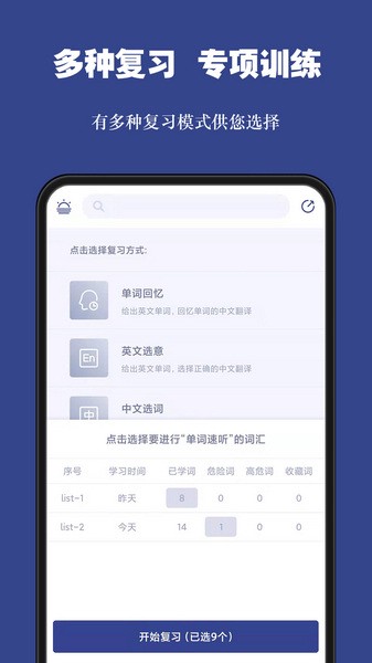 2、三大个性化记忆模式:艾宾浩斯记忆法(科学记忆)、复习记忆法(复习+记新词)、快速记忆法(记新词)