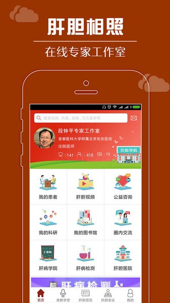 1、软件有丰富的功能应用,该功能导航页面展示了公益咨询、肝胆视频以及肝病检测等应用功能。