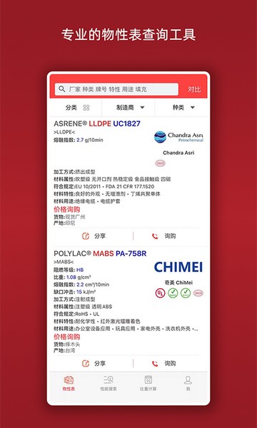 这款应用功能丰富,包括产品资料筛选、性能组合搜索、一键收藏等功能。它还支持多种检索方式,如按材料种类、名称、厂家、牌号等进行查找。此外,软件还提供了精准搜索性能指标(如熔指、拉伸、冲击等)、牌号性能对比以及全球化工厂的物性表数据。
