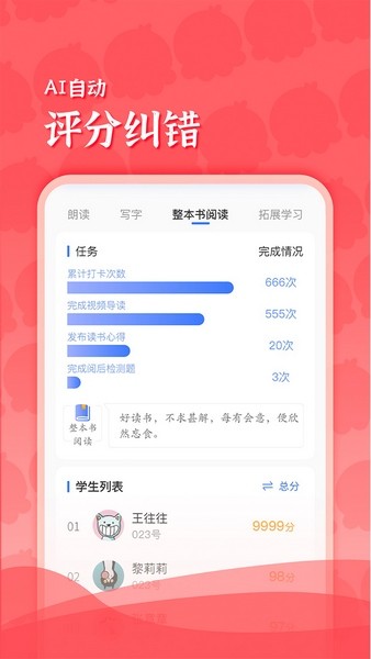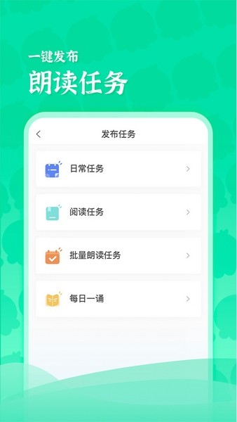 1. 多种任务一键发布:朗读、写字、整本书阅读任务,随时随地一键发布