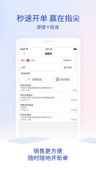 销售管理:支持查询历史售价,销售开单、退货、换货等功能,按PC端制定策略获取价格信息