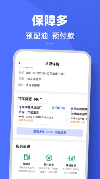 软件为用户提供了预配油、预付款等多重保障,让司机可放心的接单。