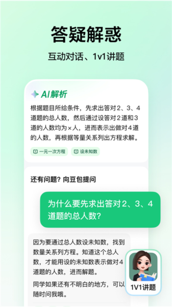 1、解题答疑: 学习过程中遇到难题,没有思路?豆包爱学的AI题目答疑功能可以及时且耐心地为你解答每一个困惑,让你不再感到迷茫。