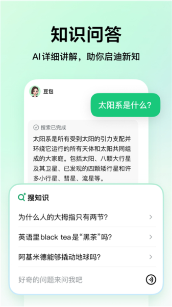 4、知识专家: 想要互动学习百科知识,但不知道该问谁?豆包爱学的AI搜知识功能以对话模式全面讲解你想知道的一切知识,满足你的求知欲。