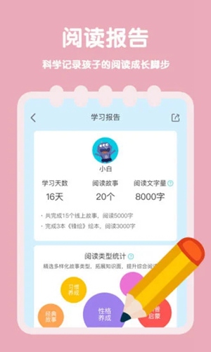 软件特色包括系统的学习模块、自动播放故事、学习报告查询等;亮点则在于记录任务完成情况、制定学习计划、科学记录阅读成长等。优势方面,它提供了海量阅读文本、语音播放功能,还能将喜欢的书籍下载到本地,方便随时阅读。