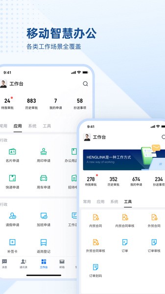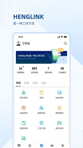 HENGLINK的特色功能挺多,比如集团通讯录可以高效管理组织架构;Web端和手机端消息实时同步,沟通很及时;工作台提供统一审批入口,处理业务更流畅。还有请假、出差、报销等OA应用,让工作变得轻松又简单。