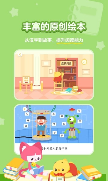 汉字大冒险包含1300常用字,通过有趣的益智游戏、可爱动画,让孩子在快乐中认识汉字。同时,汉字大冒险还配套100+原创阅读绘本,让孩子在活学活用,深入理解汉字。