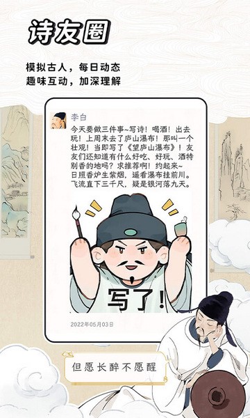 我觉得这个软件设计得挺用心的,把枯燥的学习变得有趣又有画面感。特别是水墨风的动画和诗友圈的设计,让人感觉像是穿越到了古代,和诗人一起交流。希望以后能加入更多互动元素,让学习古诗词变得更有趣!最近更新修复了一些bug,使用体验应该更好了。