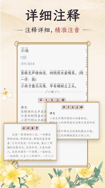 以国风为主题,设计界面充满文学氛围,呈现出优雅的古典美感,让用户在学习的同时沉浸在浓厚的文学氛围中。