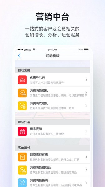 轻松发起各种活动,提供优惠券、促销活动、电子会员卡等营销工具,可帮助店铺聚集更多的会员。