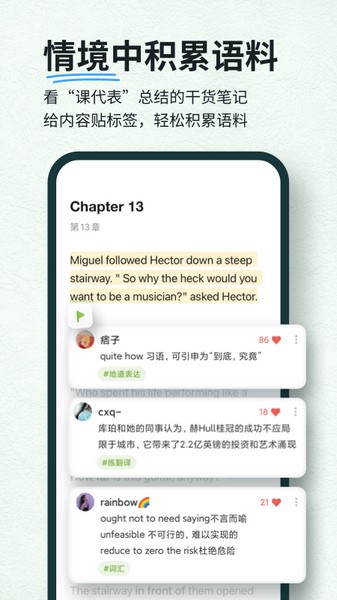 最棒的是它能记录生词并帮你记忆,特别是对考试党来说很实用,因为它会高亮四六级、考研等重点词汇。我还很喜欢它的读书笔记功能,在文章里随时记下心得,还能和其他用户互动交流,挺有趣的。
