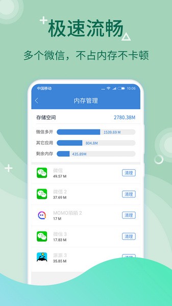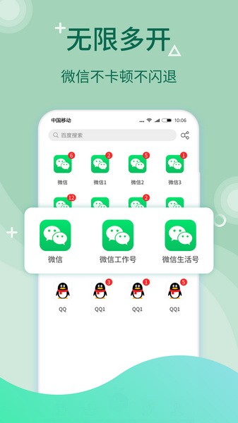 全球首创应用多开分身功能,更稳定的微信多开宝,完美支持微信多开、QQ多开、派派多开、淘宝多开、闲鱼多开、游戏多开等所有应用无限多开,依托独立内存管理机制,手机无限多开不卡顿。