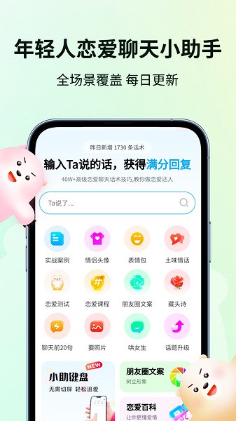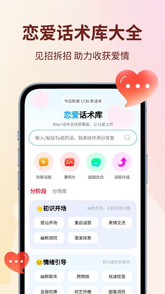 这款恋小助app简直就是社交焦虑者的救星!它能帮你解决聊天时不知道说什么的尴尬,提供各种恋爱技巧和高情商回复。里面有很多分类清晰的话术库,还有土味情话随时更新,简直是追爱必备神器。