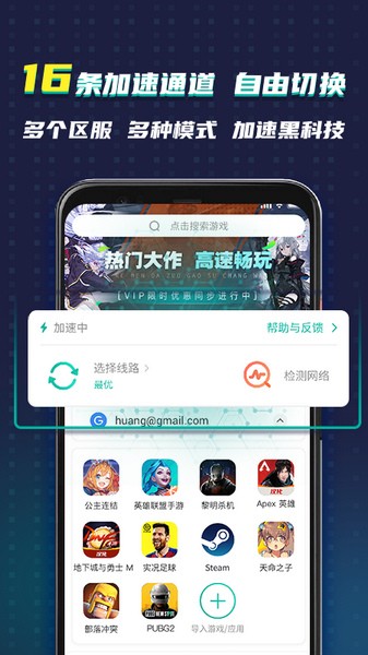 加速器支持吃鸡、王者荣耀、和平精英、穿越火线、使命召唤、第五人格、阴阳师、游戏王、王牌战士、绝地求生、狂野飙车、文明重启、闪耀暖暖、部落冲突、刀塔、方舟:生存进化、黑色沙漠、堡垒之夜、对峙2、第二银河、现代战争5、刺客信条、公主连结等热门游戏的多个区服加速!