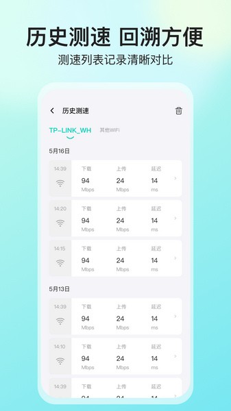 3、历史追踪:测速历史一目了然,轻松查阅,点击后查看当前测速的测速报告。