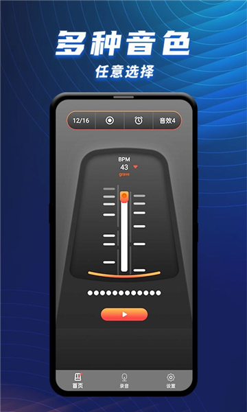 节拍器乐器大师是为所有热爱音乐之人量身定制的一款专业级应用。它不仅仅是一个简单的节拍器,而是集多功能于一身,旨在为音乐初学者和专业人士提供全面的练习支持。应用内置了多种不同的速度和节奏选项,无论是想提升乐器演奏技巧,还是调整乐器的音准,甚至是录制音乐作品,都可以通过节拍器乐器大师轻松实现。