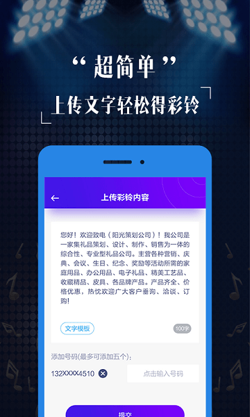 在文字模板中,上传你要定制的文本内容,输入手机号码,选择“提交”。