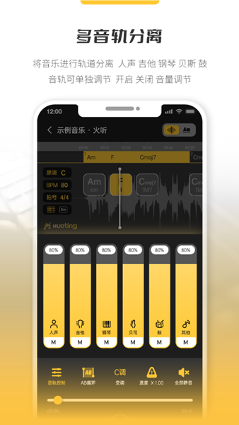 火听分轨伴奏是一款实用的音乐处理工具软件,软件内包含了许多非常多样和强大的音乐处理功能,能够帮助用户进行全面的音乐处理,让用户的音乐创作更加简单方便。本软件将能够帮助用户轻松的进行一站式音乐处理,无论是音轨分离还是各种调整升降调,都可以进行自由控制,还可以对音乐演唱进行辅助,让用户轻松进行高质量演唱。