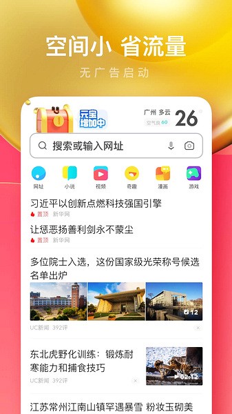 UC浏览器极速版APP里面的内容非常的丰富,用户可随时在线浏览各样热门资讯、刷各样短视频以及免费阅读各样优质小说等等,非常的方便;软件还为用户提供了搜索栏,用户可利用搜索栏便捷查找自己想了解的各样内容,省事又省力。