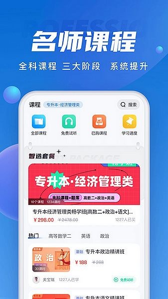 成考全科目全套课程,教材精讲、习题精析、真题解析、应试技巧,三大阶段四大班型,系统学习,逐步提升。