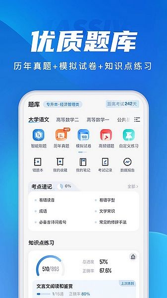 成人高考题库内含考点练习,全国通用卷以及地区卷模拟练习,以及按照固定考试比重的随机式的抽题的真题考场,成绩单实时记录考试数据,一点一滴的反馈考生近期学习状态以及自我正确率的提升,大大的给予考生通过考试的信心。