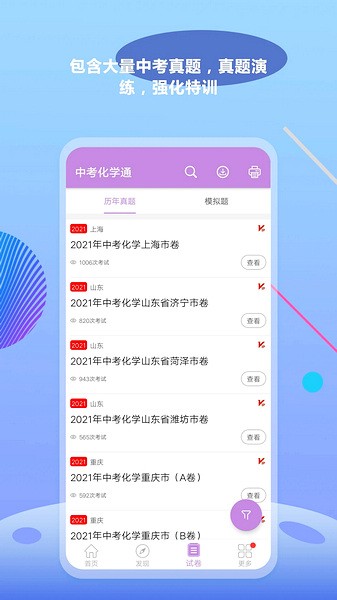 4、切换到【试卷】页,能按地区、年份、是否免费筛选中考试卷,了解各试卷考试次数,按需选择练习。
