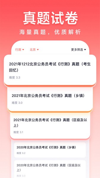 【练】「真题试卷」涵盖公务员、事业单位近十年真题,助你了解历年考情,还原真实考场;「定制练习」匹配你当前能力等级的专属题库,告别题海战术,提高刷题效率,助你高效提分;「专项练习」分知识点刷题,供你挑选薄弱知识点进行练习,帮你重点突破,刷题更有方向。